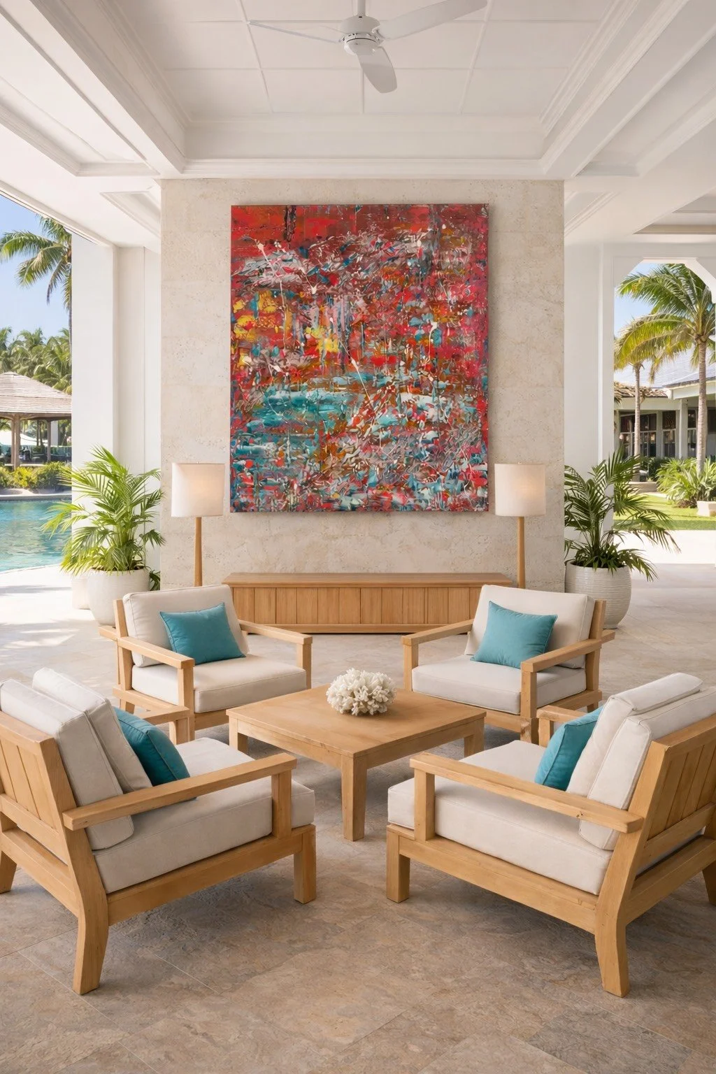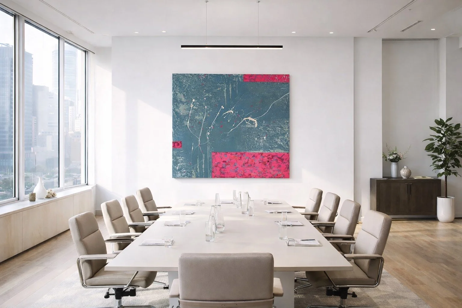 Je développe un travail pictural abstrait pensé pour dialoguer avec les espaces professionnels, hôteliers et tertiaires.