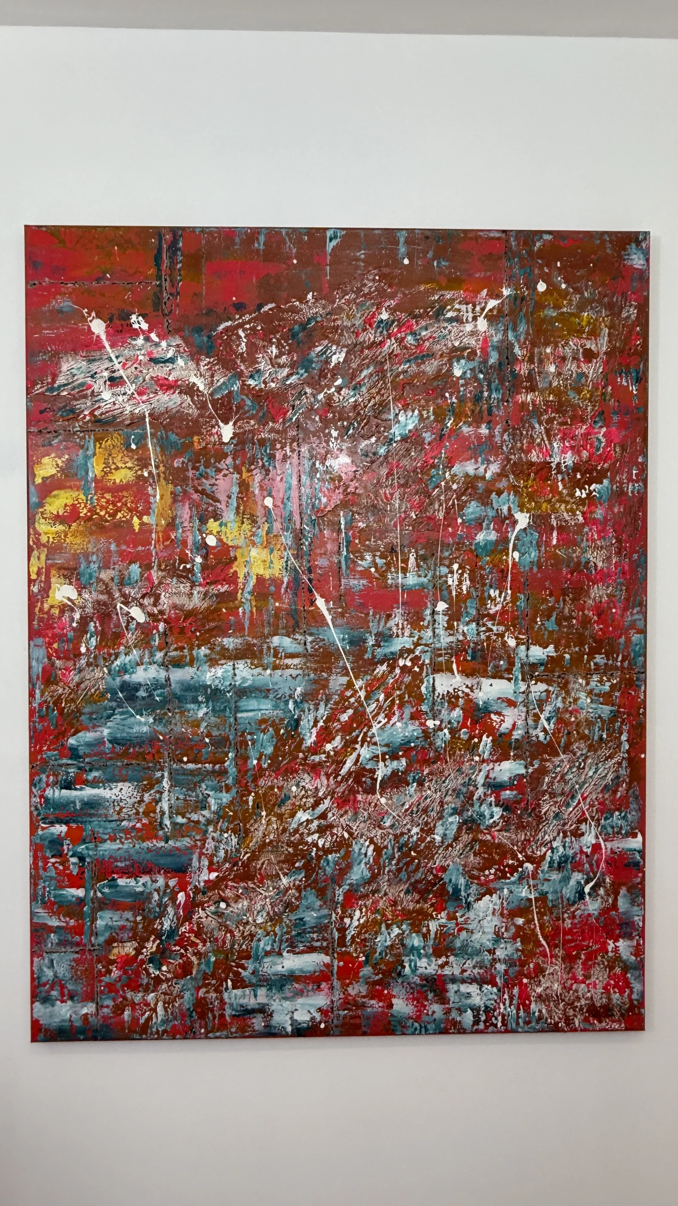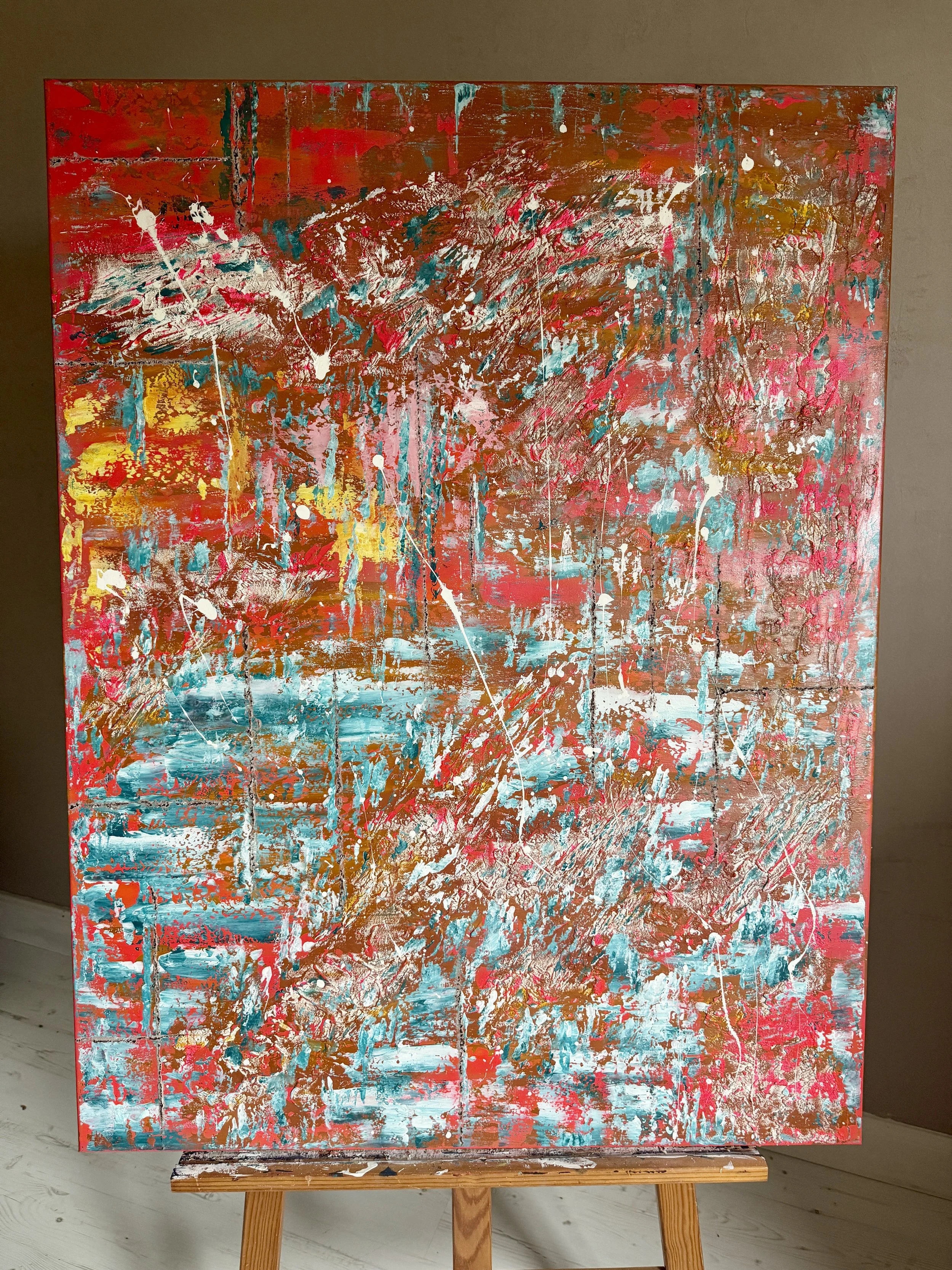 "Collision" s’ouvre comme un paysage émotionnel en fusion, dominé par des tons de rose vif, corail, orangé brûlé, et de larges pans de bleu turquoise, le tout ponctué de blancs éclaboussés et de strates texturées. Le rose ici n’est pas doux ou romantique, mais pulsé, vivant, presque incandescent. Il dialogue avec les autres couleurs dans une dynamique de contraste et de superposition.