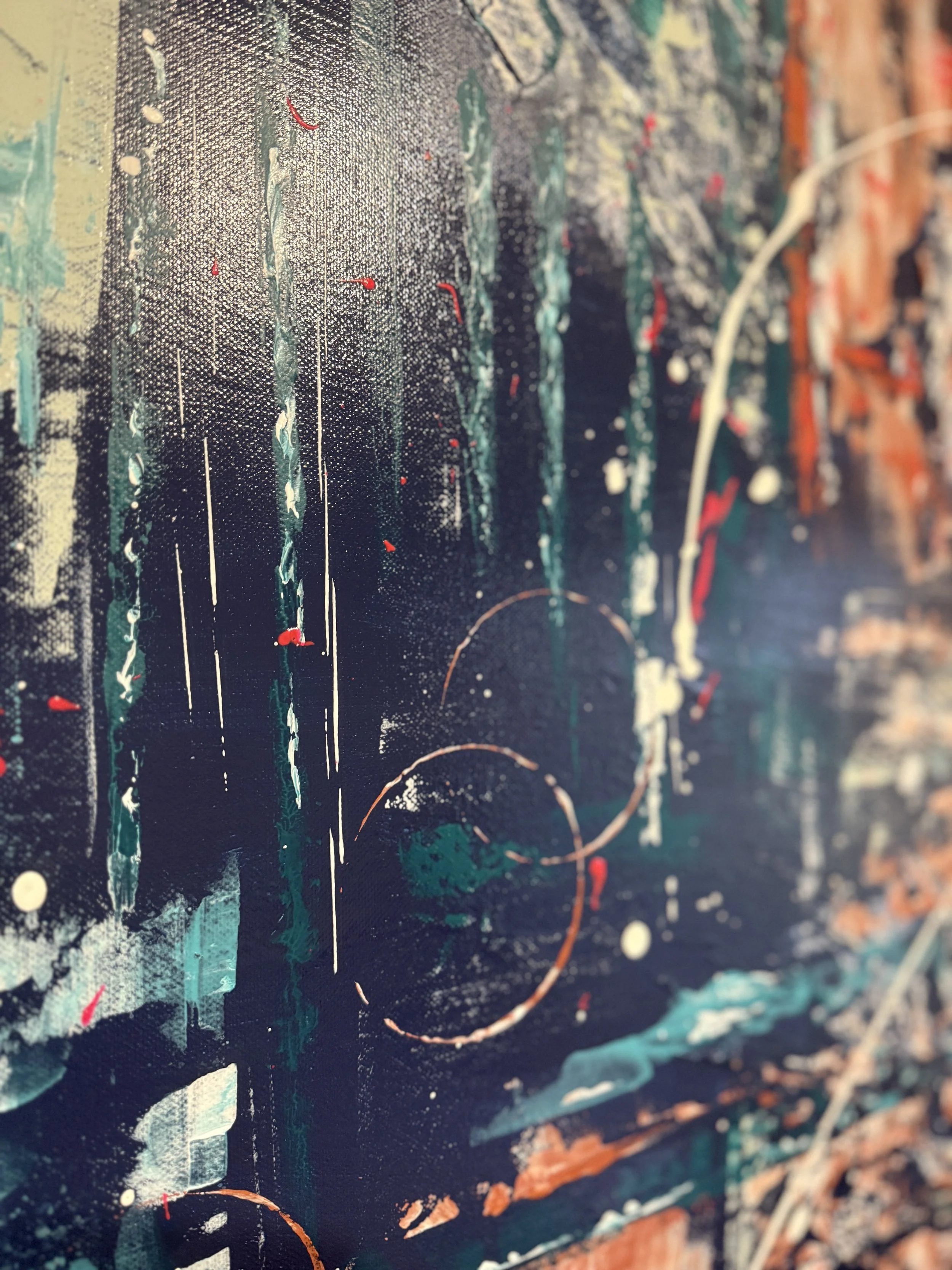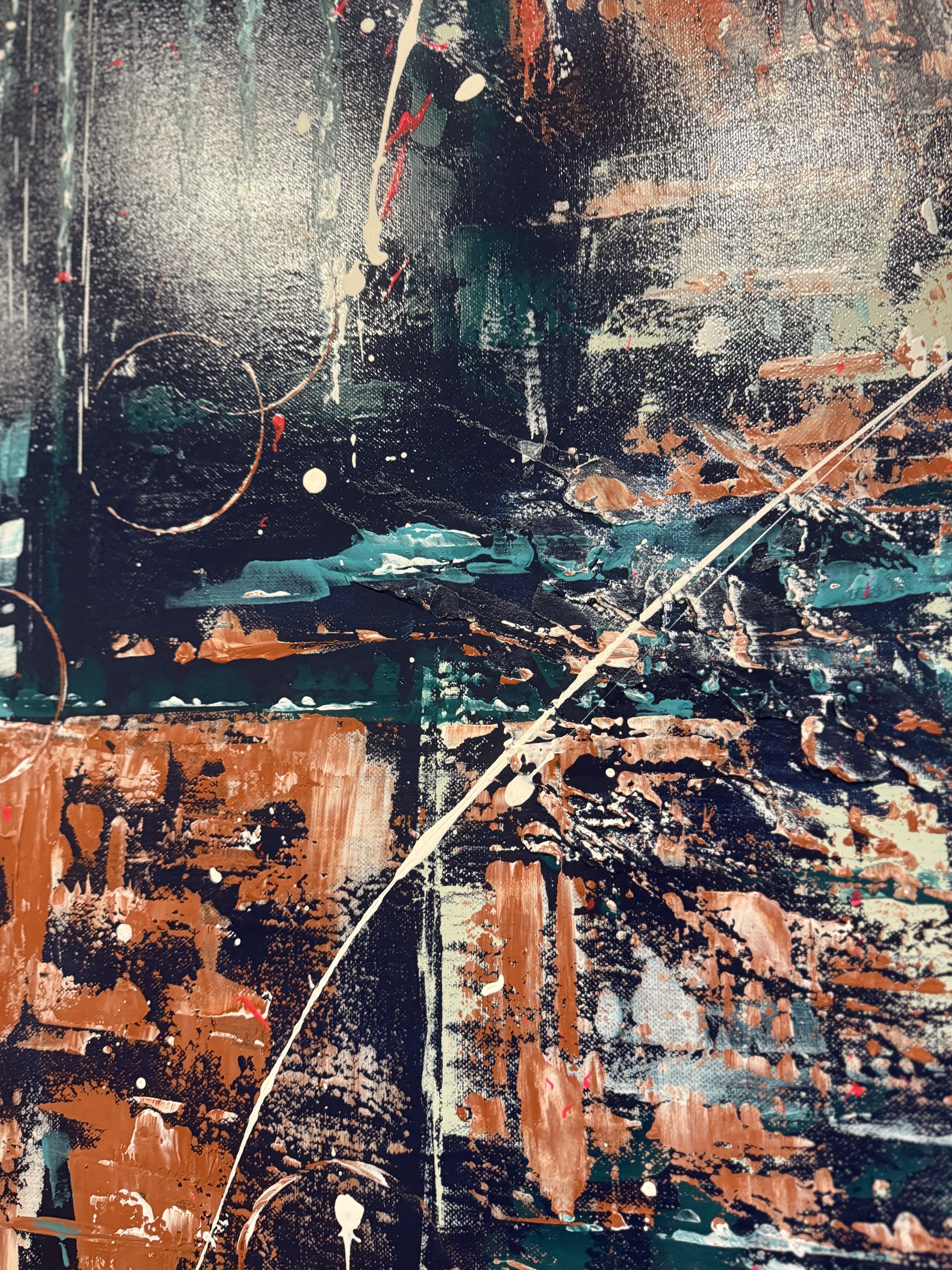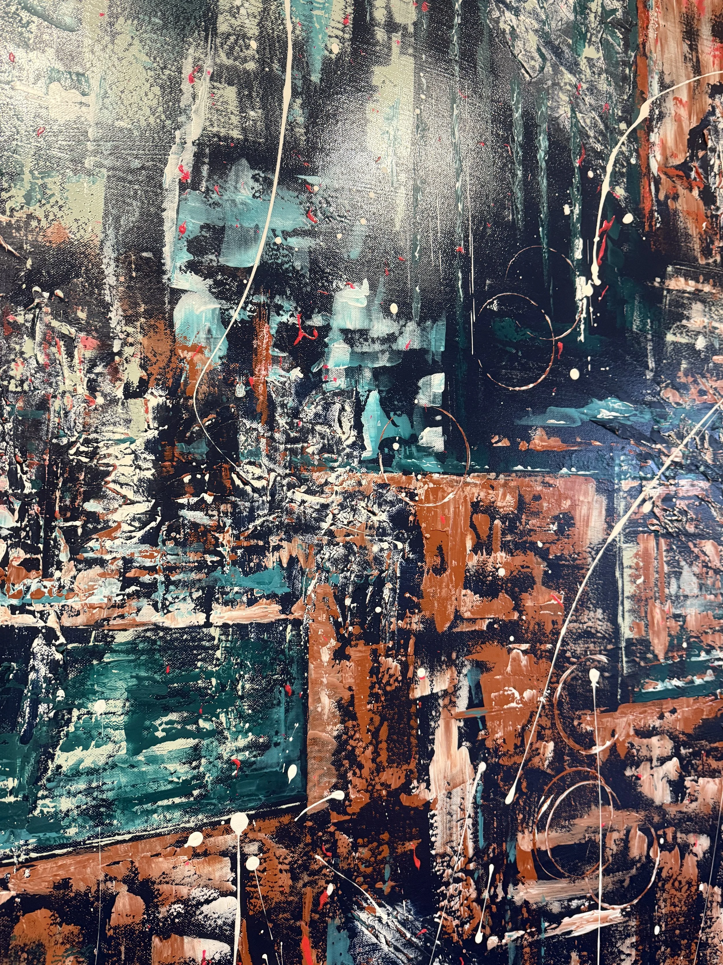 Blue Monday 2 est une immersion dans une matière dense, presque urbaine, où le bleu profond structure l’espace comme une architecture intérieure. Sur cette base sombre se superposent des éclats de turquoise, de cuivre et de blanc, déposés en touches heurtées ou en glissements légers. Les strates s’accrochent, se chevauchent, s’effacent par endroits : la toile respire comme un paysage en reconstruction.