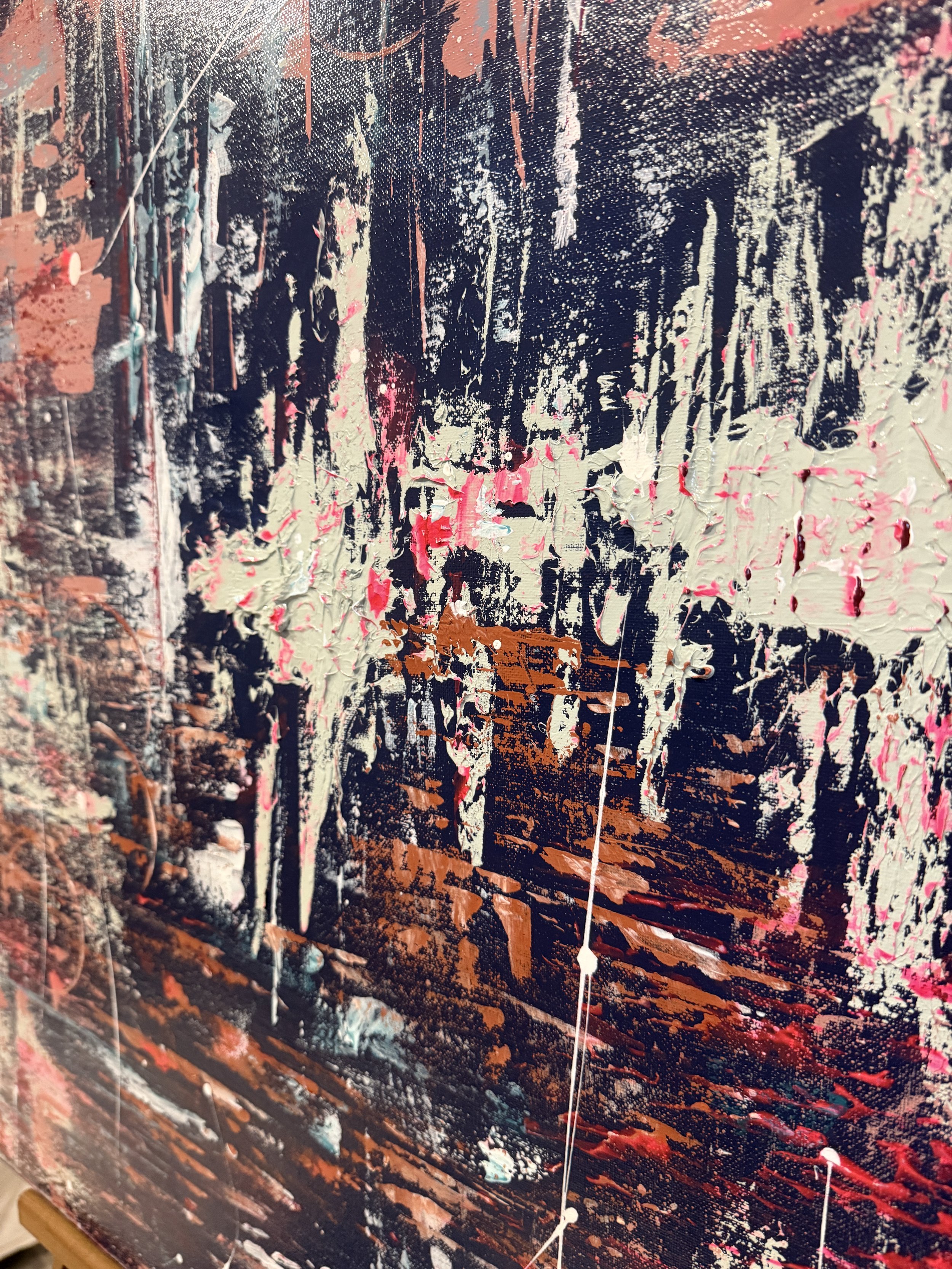 Chaque couche semble à la fois dissimuler et révéler, comme si la peinture cherchait à retenir le mouvement avant qu’il ne s’échappe. Les traces verticales dialoguent avec des lignes courbes, libres et spontanées, qui viennent troubler l’ordre établi — souffle, respiration, tension vitale.