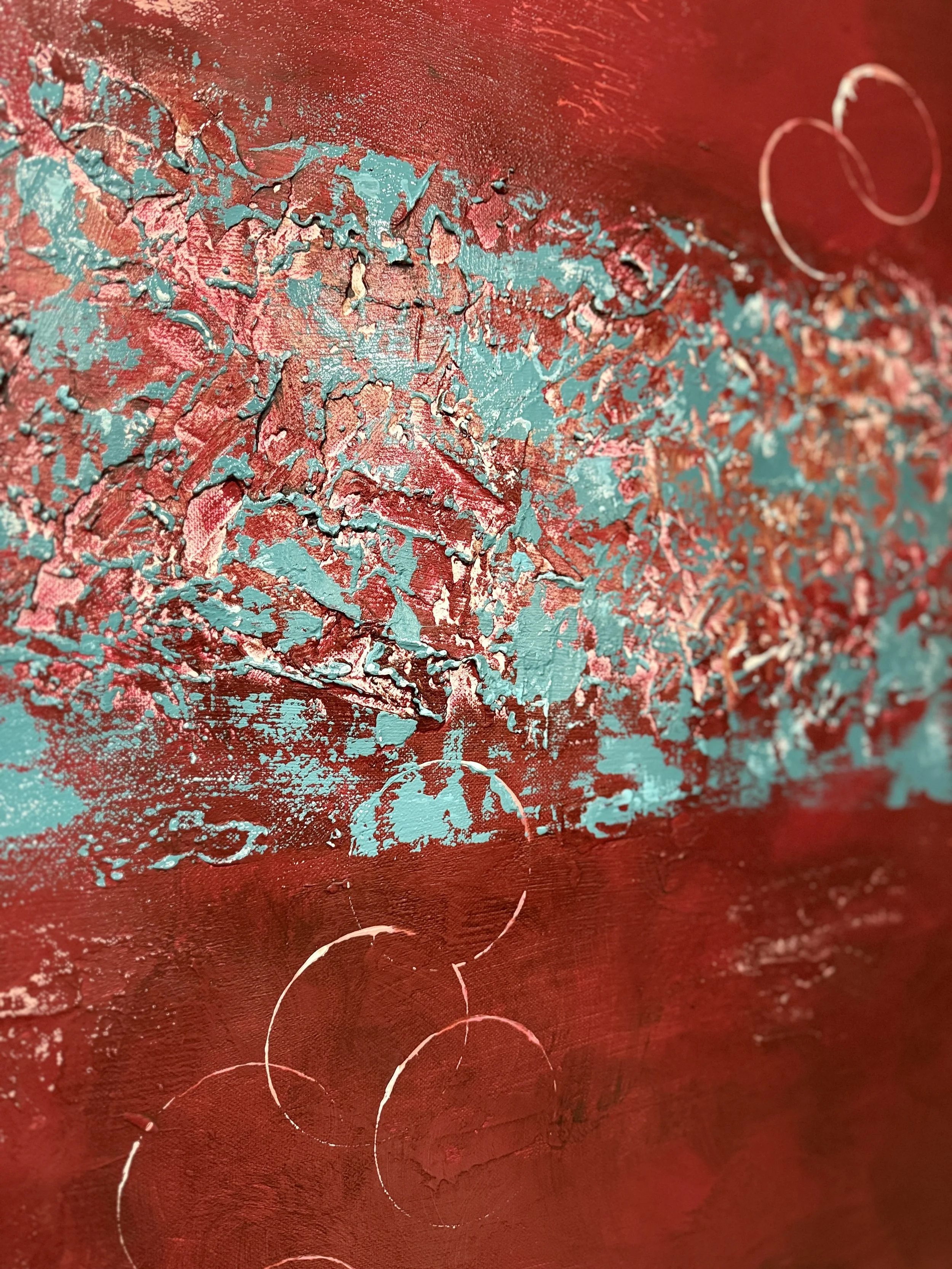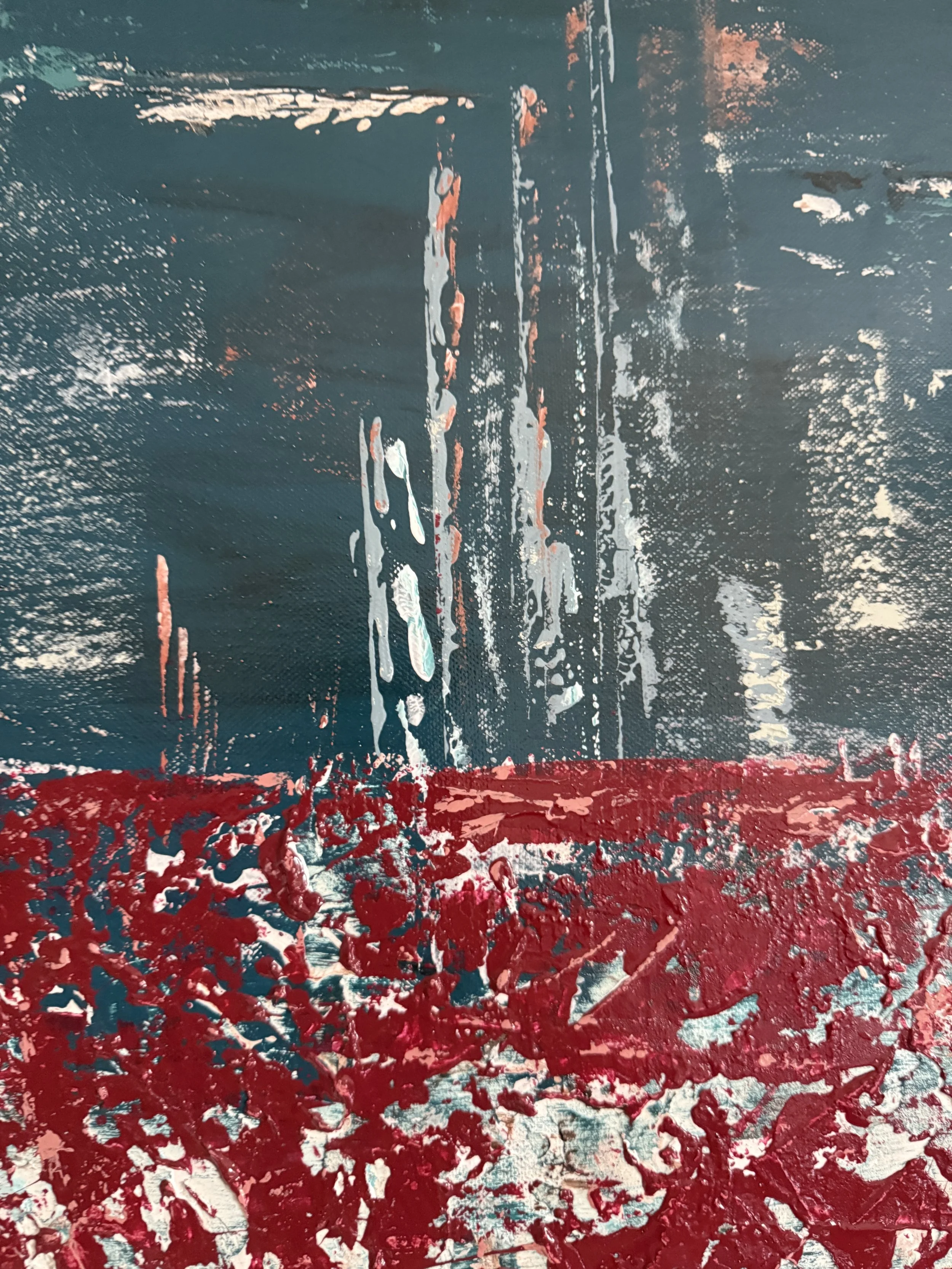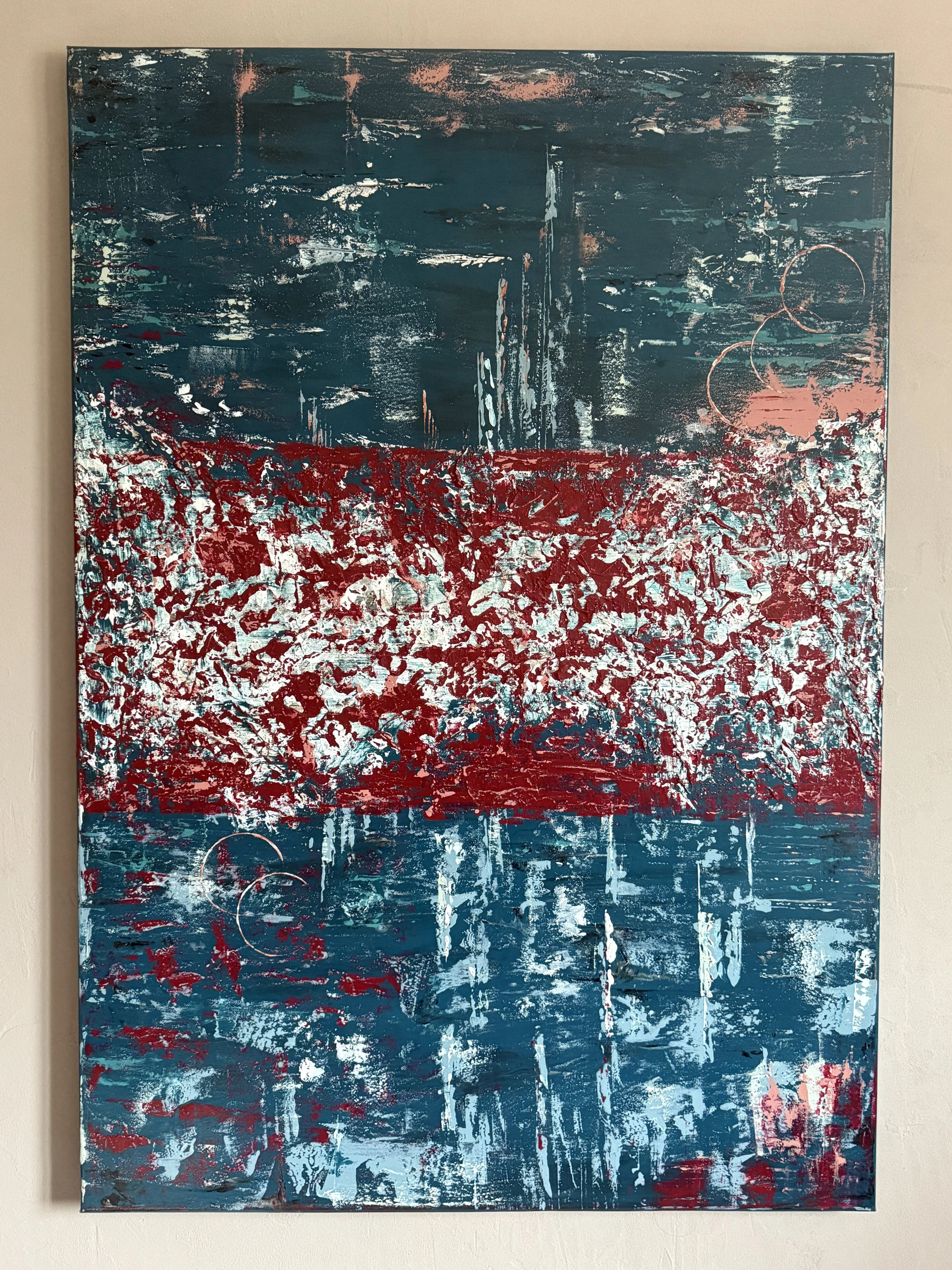 Passage² s’inscrit dans une exploration des paysages océaniques intérieurs. L’œuvre se structure autour d’une bande centrale éclatée, où le rouge et les blancs s’agrègent en une matière dense, presque minérale. Cette zone de rupture évoque un passage : un seuil mouvant où se rencontrent la surface agitée et les profondeurs plus calmes.