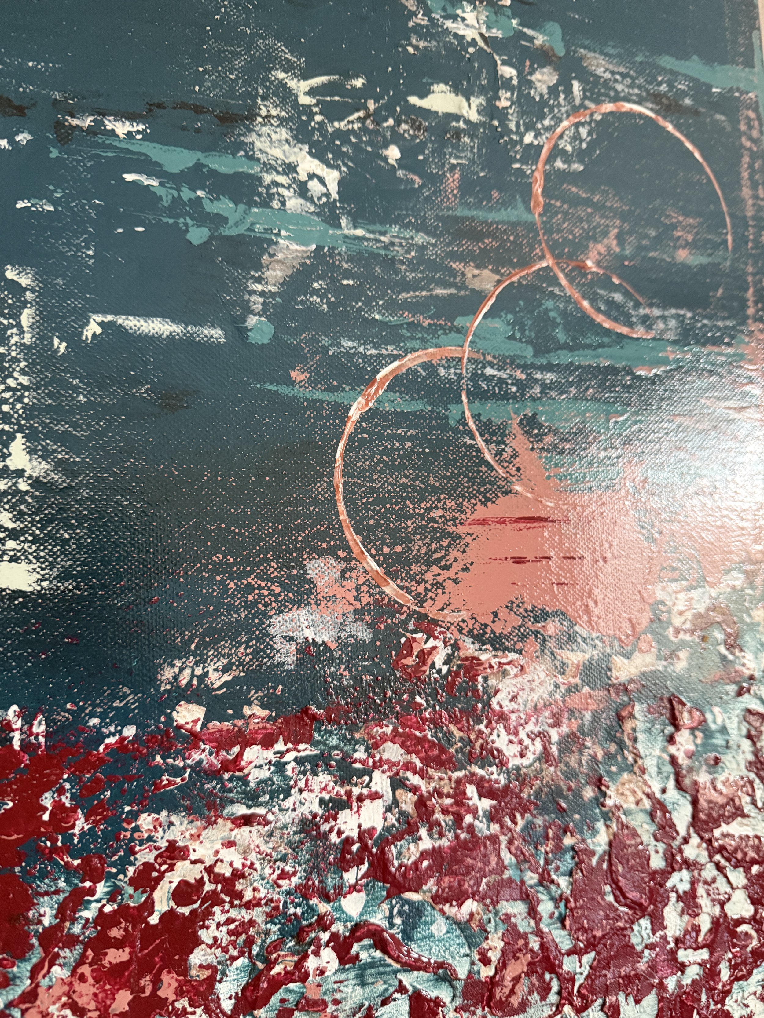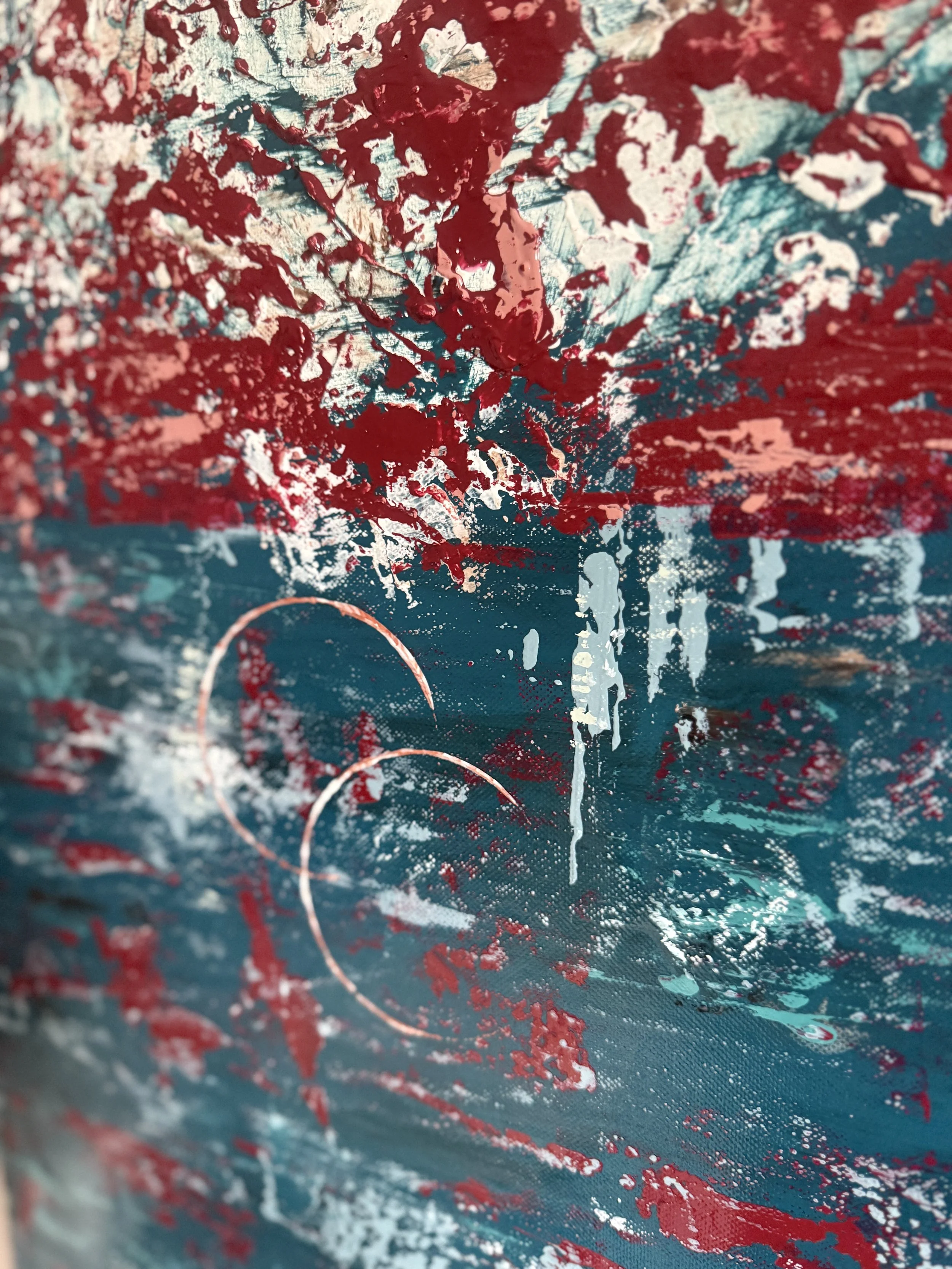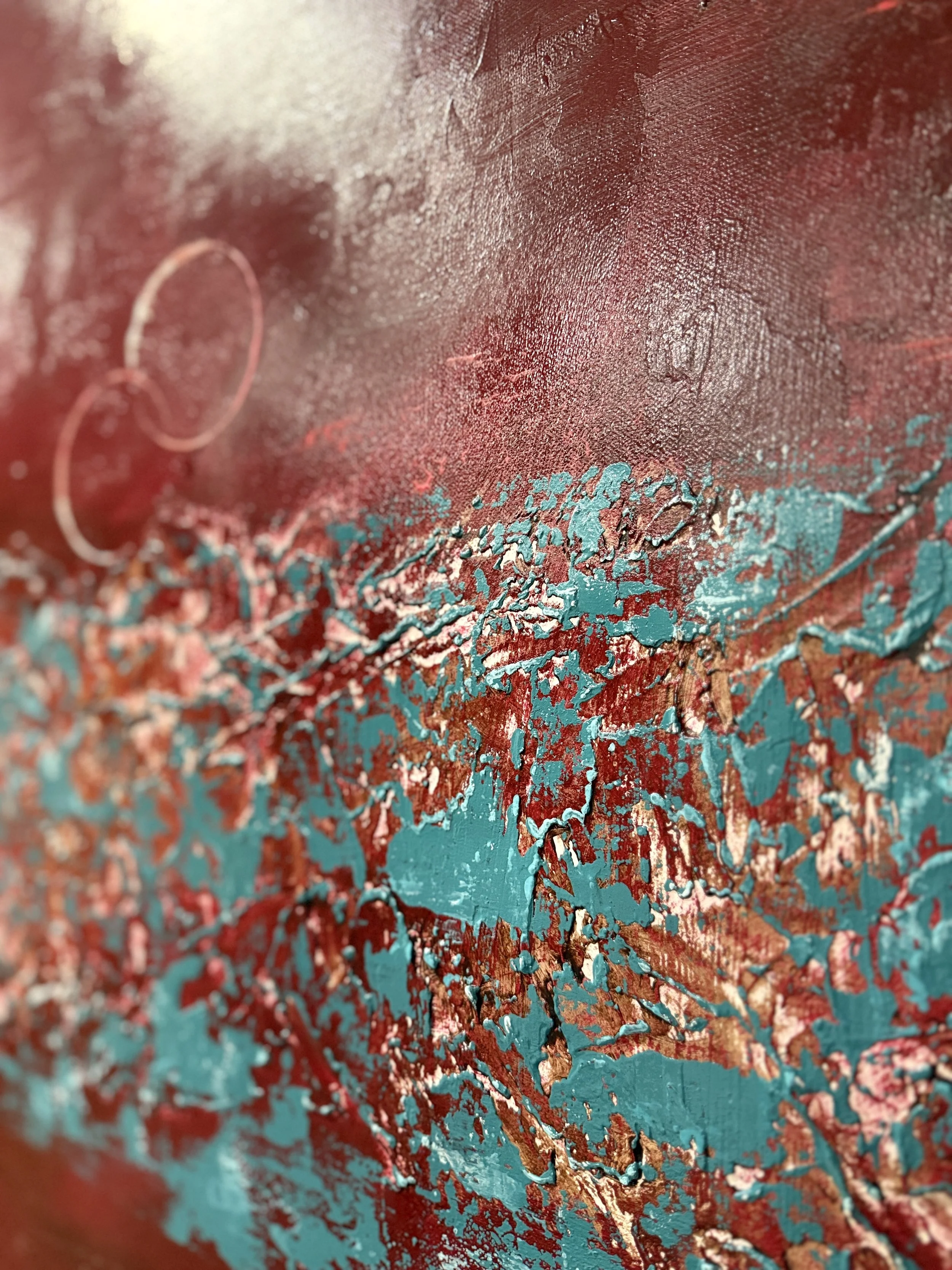 Passage² s’inscrit dans une exploration des paysages océaniques intérieurs. L’œuvre se structure autour d’une bande centrale éclatée, où le rouge et les blancs s’agrègent en une matière dense, presque minérale. Cette zone de rupture évoque un passage : un seuil mouvant où se rencontrent la surface agitée et les profondeurs plus calmes.