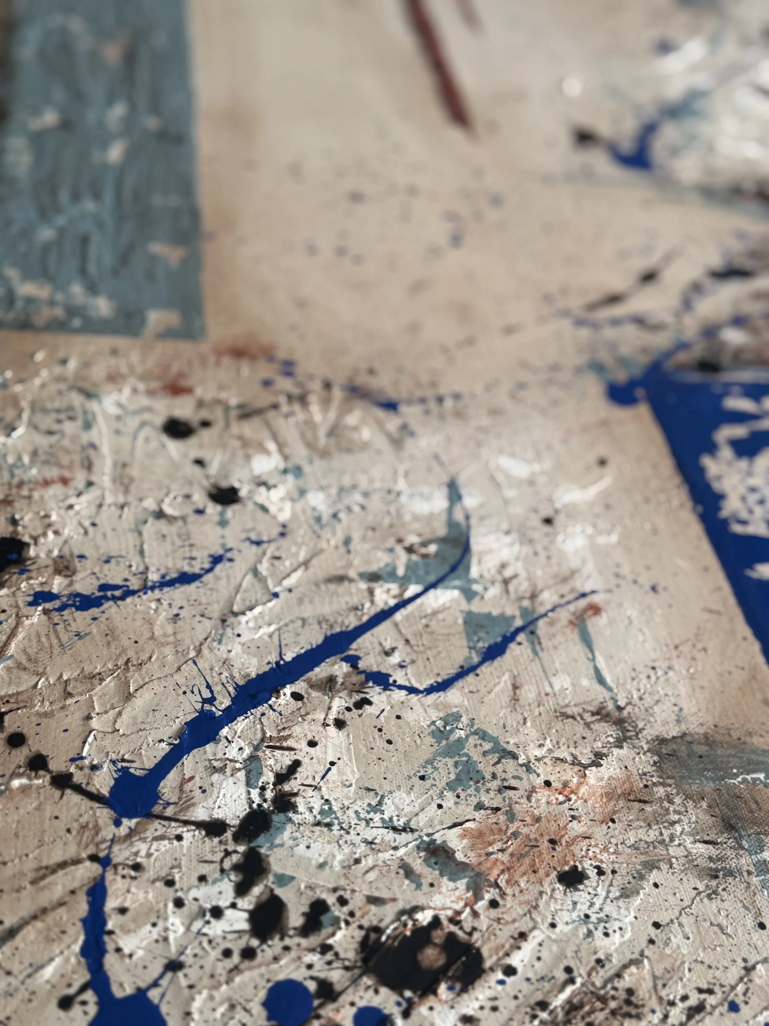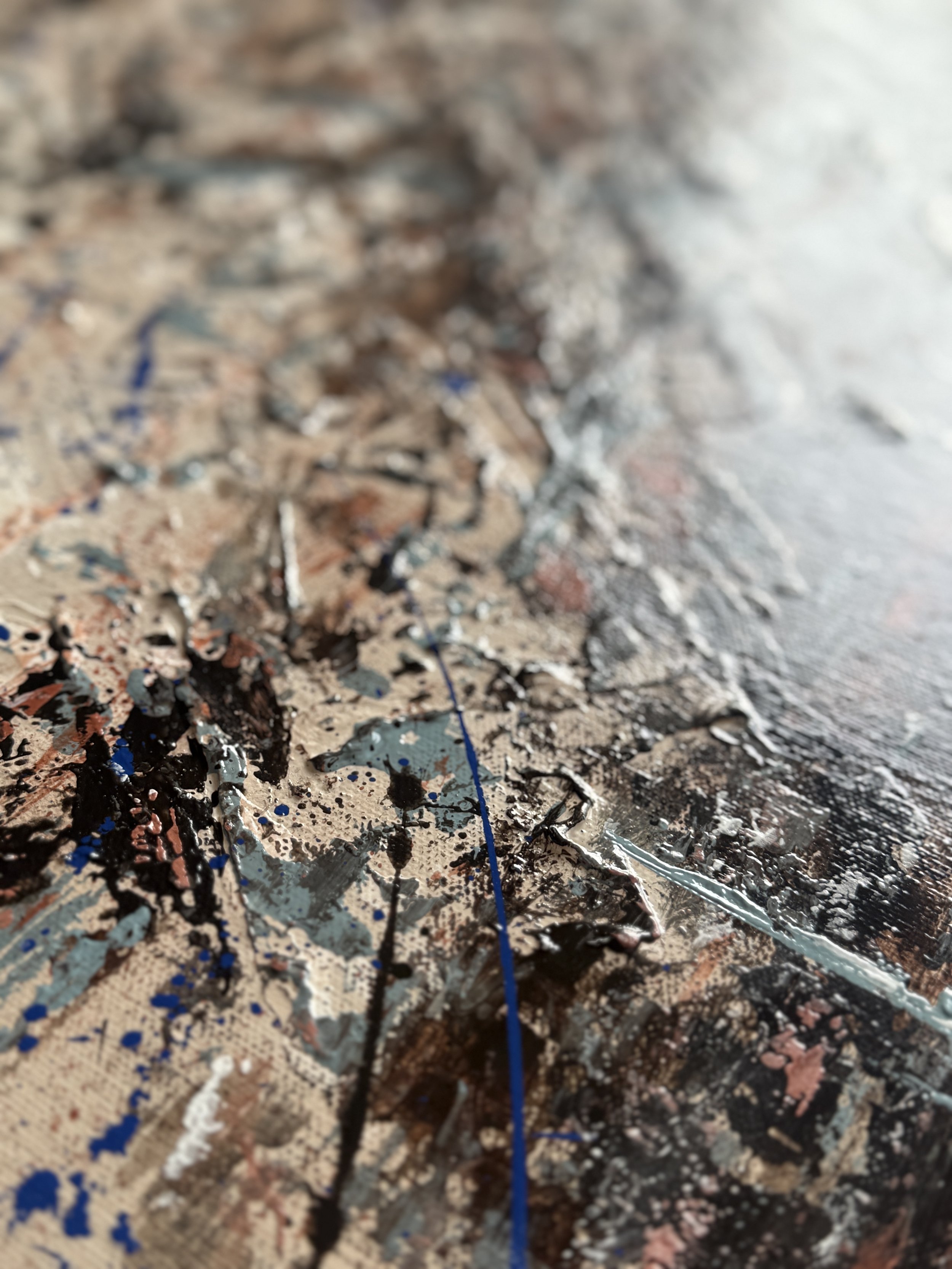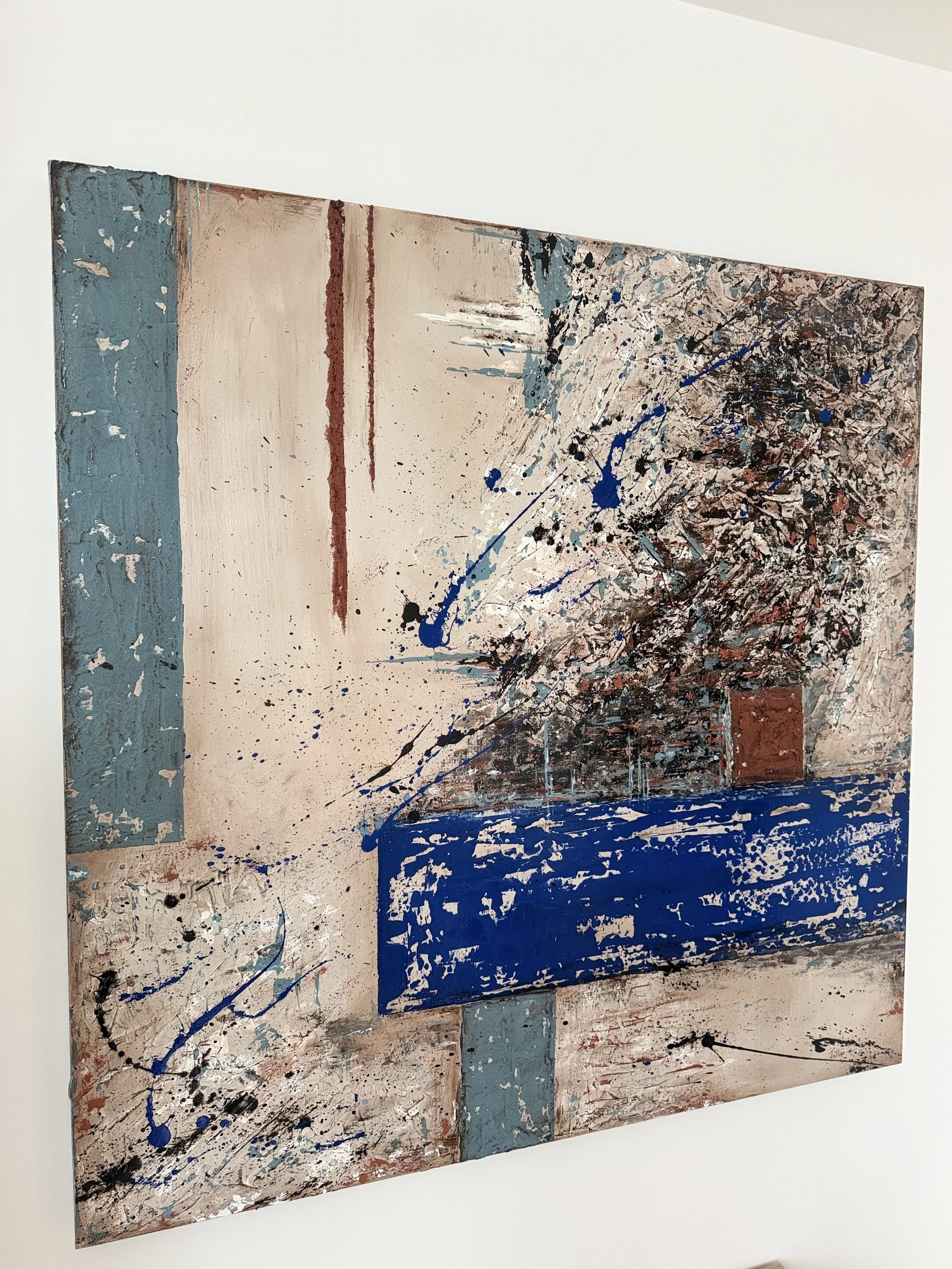L’œuvre invite le regard à circuler le long de cette frontière fragile, où coexistent contrôle et spontanéité, et où la surface devient la trace d’un temps accumulé.
