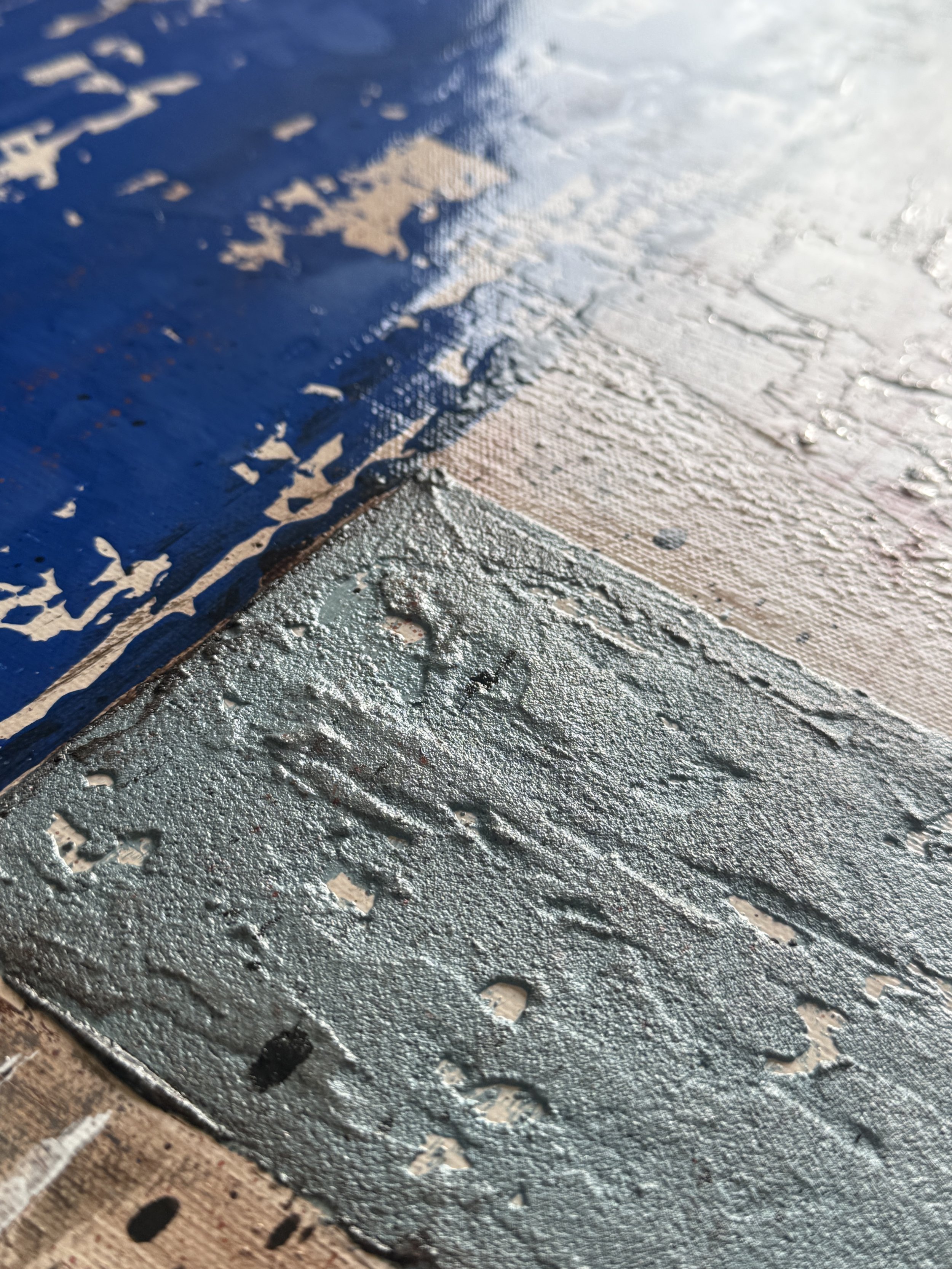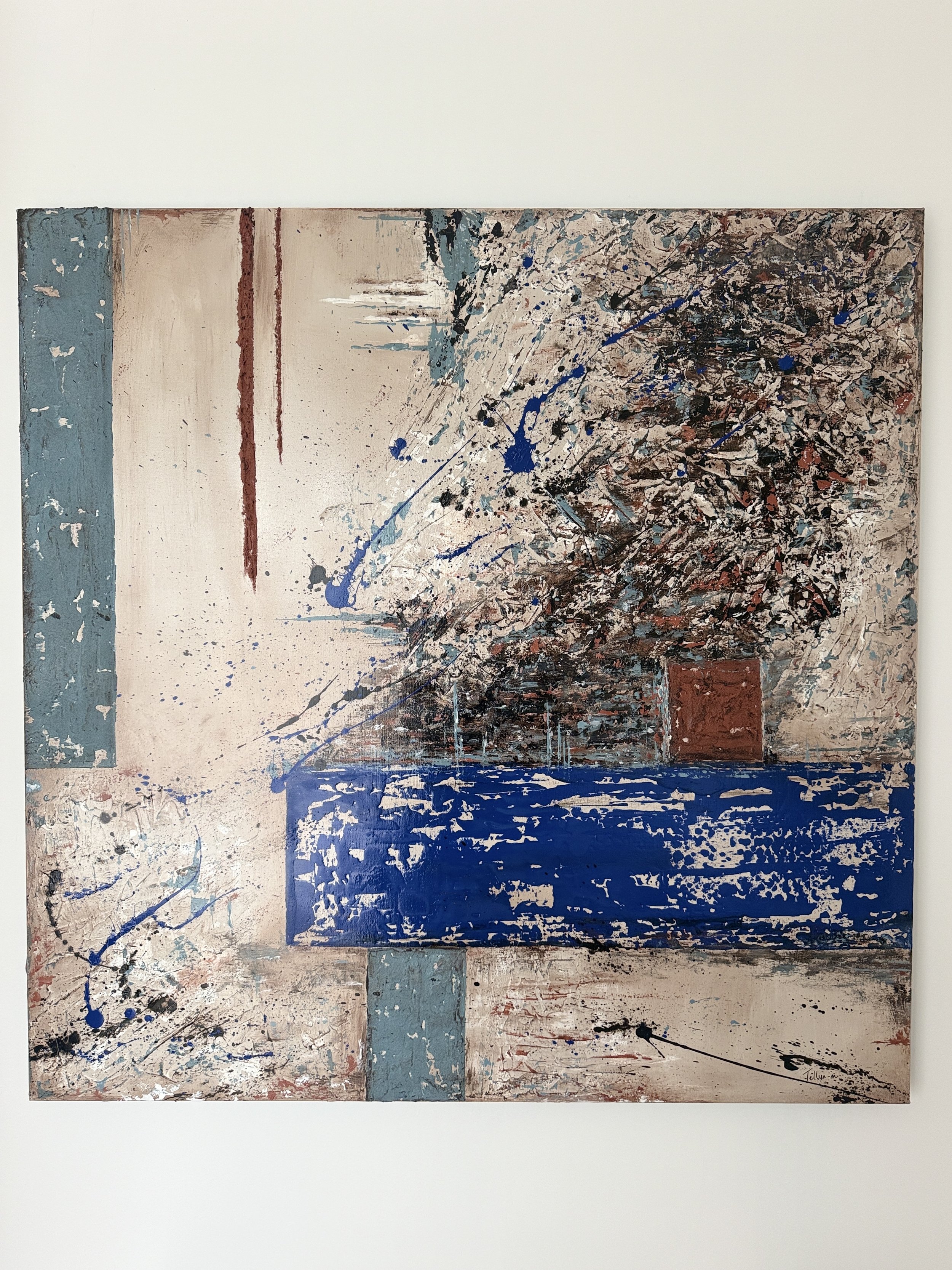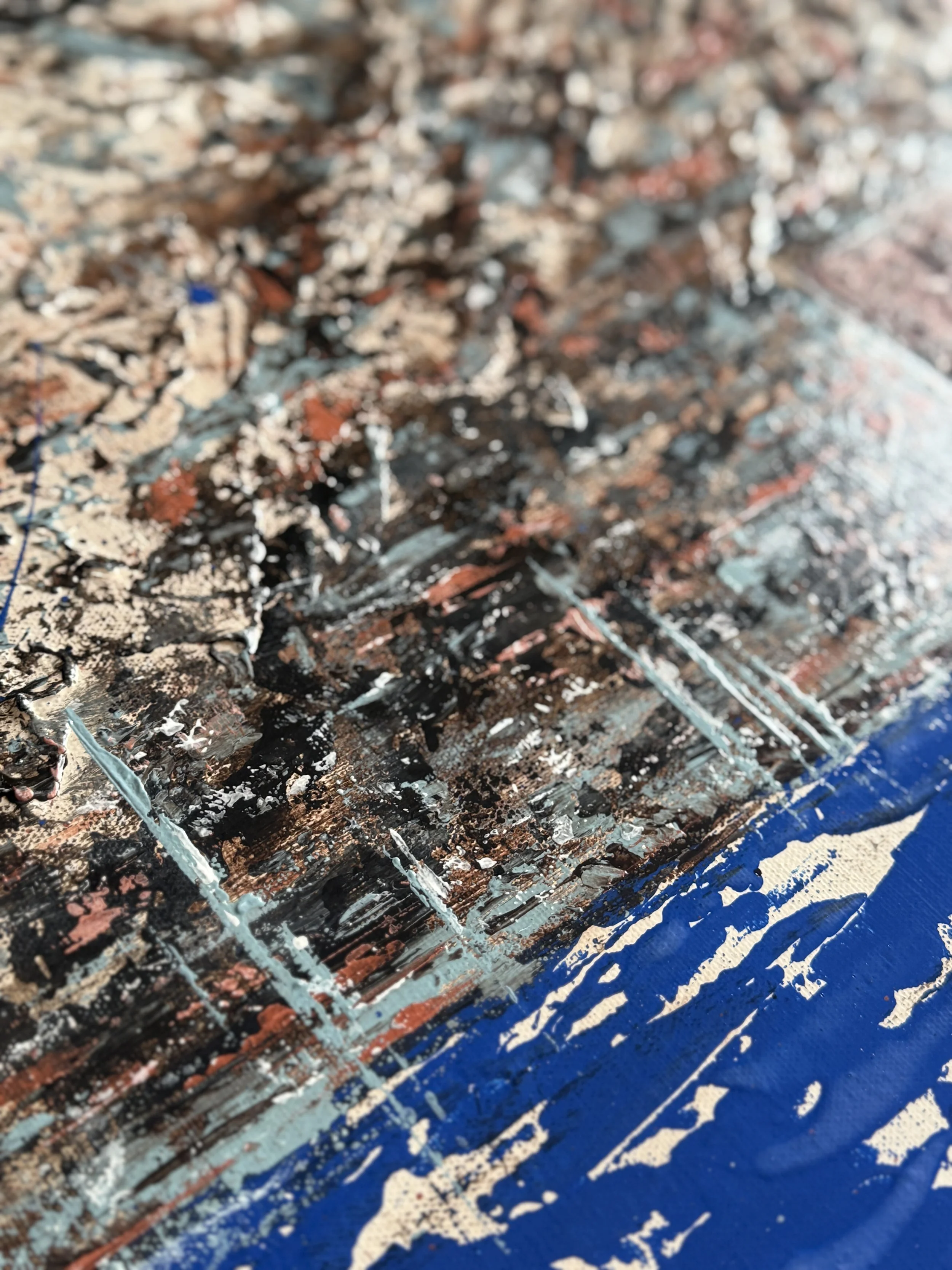 Des formes construites et des masses chromatiques denses tentent d’imposer un ordre, tandis que la matière fragmentée, les projections et les strates érodées viennent troubler la surface.