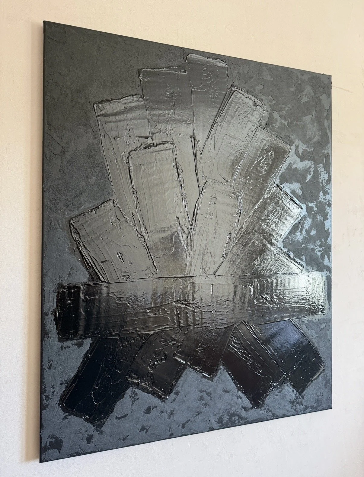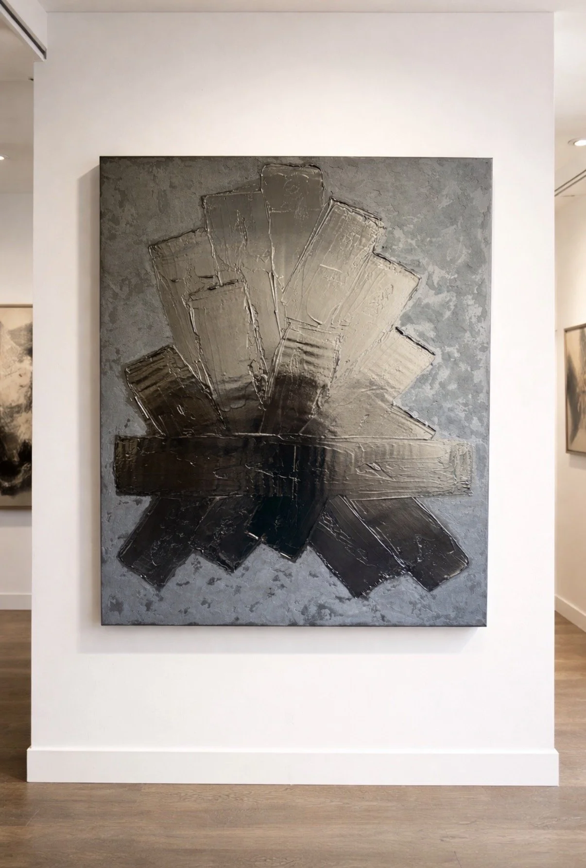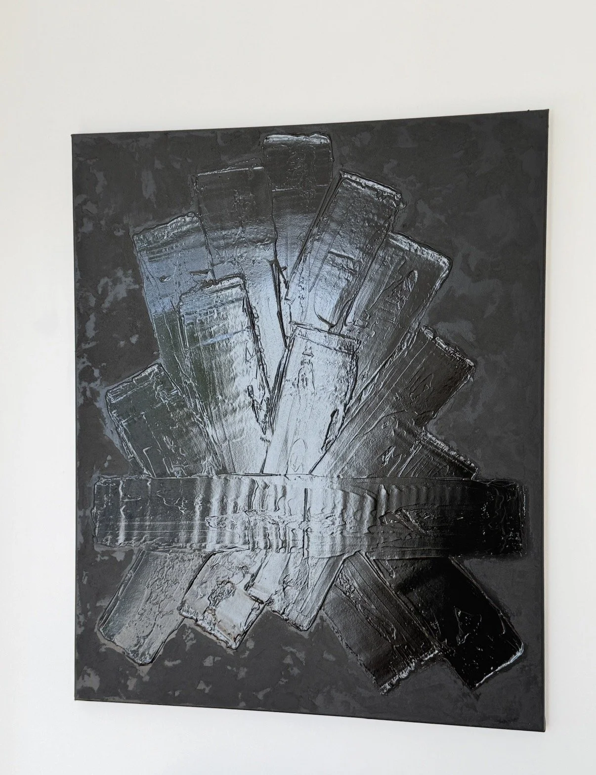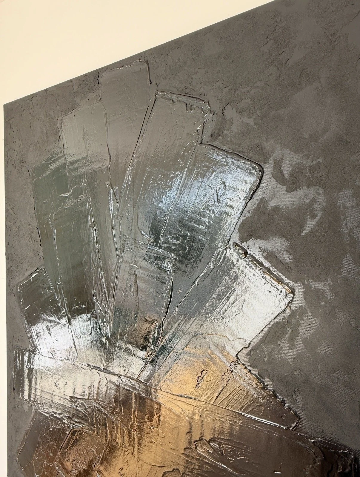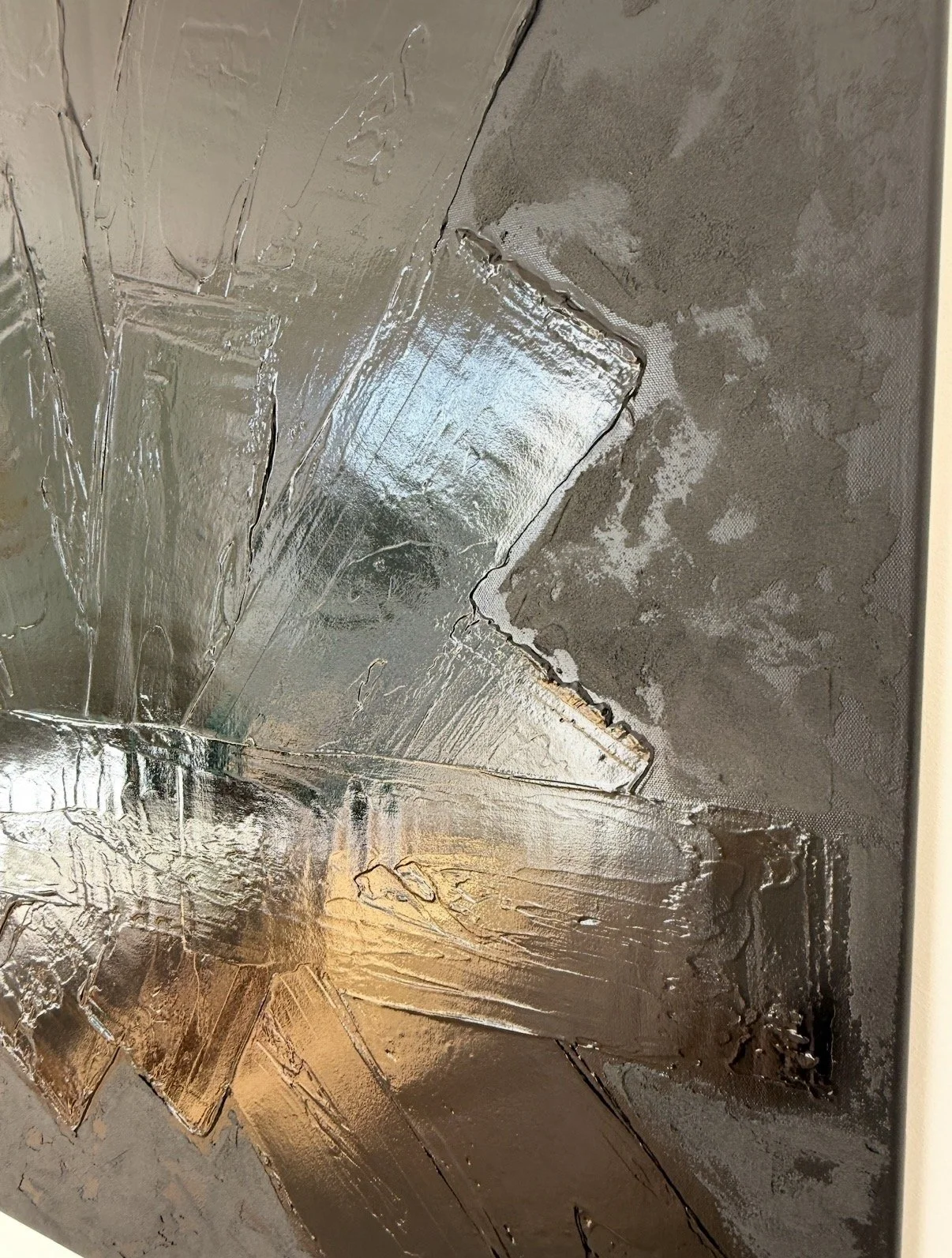 La matière y est travaillée en épaisseur, sculptée, parfois retenue, parfois libérée. Elle capte la lumière de manière inégale, révélant des zones enfouies, comme autant de traces d’un temps accumulé. Rien n’est totalement figé : l’équilibre reste précaire, toujours en mouvement.